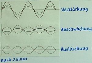 Dr. Hans NemecGesamtheit aller Erscheinungen, die durch Überlagerung zweier oder mehrer Wellen am gleichen Ort entstehen. Trifft Berg mit Tal von zwei Wellen gleicher Schwingungszahl aufeinander, kommt es zur Auslöschung, trifft Berg auf Berg bzw. Tal auf Tal, kommt es zur Verstärkung. Durch die Überlagerung von Wellen etwas verschiedener Frequenzen entstehen Schwebungen.